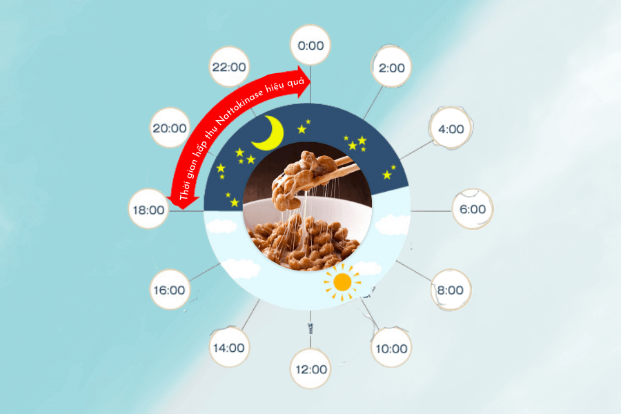 Việc sử dụng Nattokinase vào thời điểm phù hợp có thể tăng hiệu quả của sản phẩm. Vì cục máu đông dễ hình thành từ đêm khuya đến sáng sớm, nên sau bữa tối hoặc trước khi đi ngủ là thời điểm tốt để sử dụng Nattokinase.