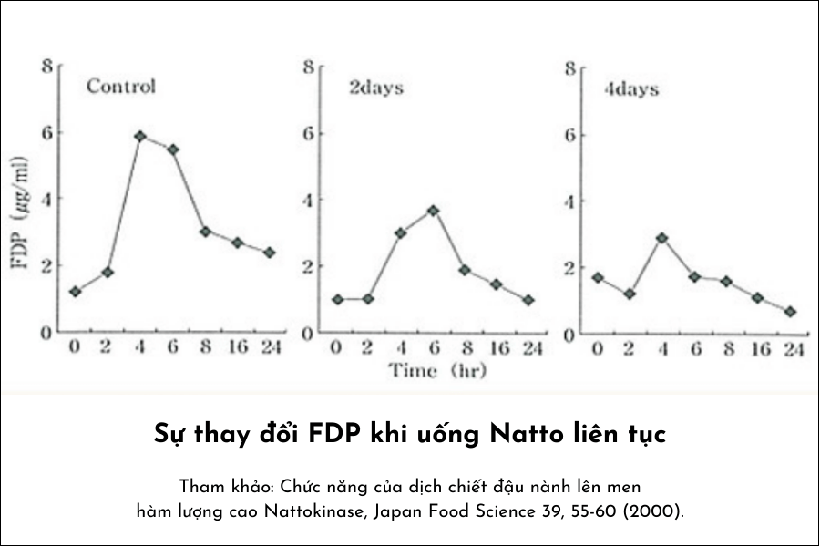 Kết quả cho thấy số lượng đỉnh FDP (Fibrin Degradation Product - phân giải fibrin) giảm xuống khi các tình nguyện viên ăn Nattō nhiều lần hơn. Hay nói cách khác, các fibrin trong cơ thể họ đã suy giảm do ăn Natto liên tục.