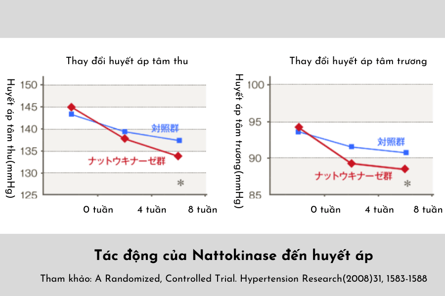 Kết quả nghiên cứu được công bố trên tạp chí Hypertension Research - tạp chí chuyên đăng các bài nghiên cứu liên quan đến chủ đề huyết áp, đã quan sát thấy sự sụt giảm đáng kể huyết áp tâm thu và huyết áp tâm trương sau khi các tình nguyện viên được bổ sung Nattokinase trong khoảng thời gian nhất định.
