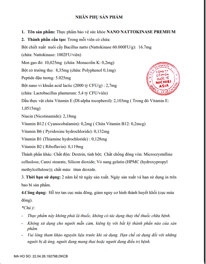- Bột chiết xuất nuôi cấy Bacillus natto (Nattokinase 60.000FU/g): 16.7mg