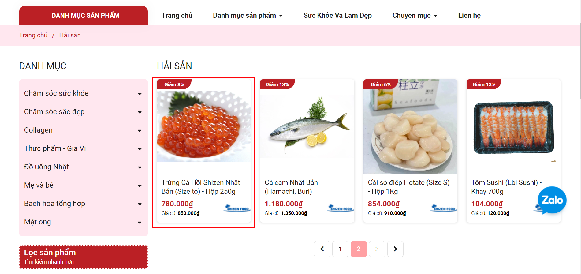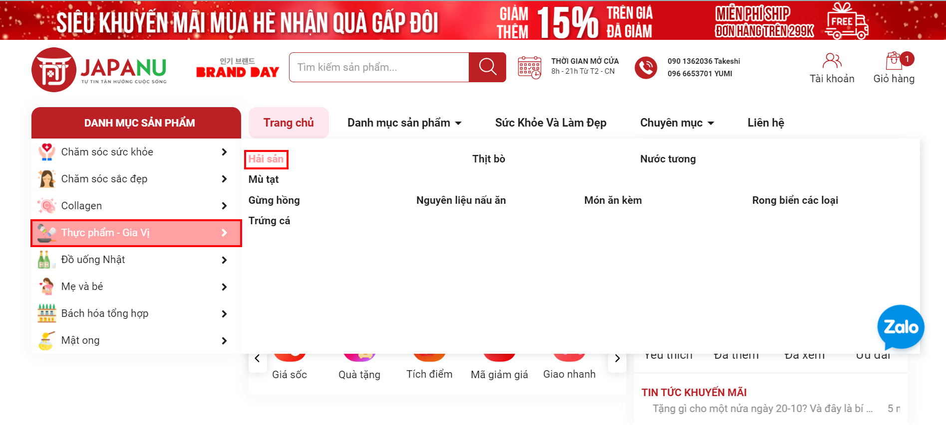 Bước 2: Tại “Danh mục sản phẩm”, lựa chọn danh mục chứa sản phẩm cần mua sẽ sổ ra nhiều sản phẩm con. Tiếp tục bấm vào sản phẩm con để tiến hành mua hàng. Ví dụ sản phẩm “Hải Sản” nằm trong danh mục “Thực phẩm – Gia vị”.