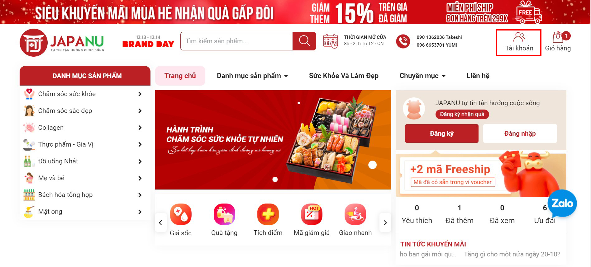 Bước 1: Truy cập website japanu.vn. Nếu quý khách chưa có tài khoản có thể đăng ký tài khoản tại góc phải màn hình.