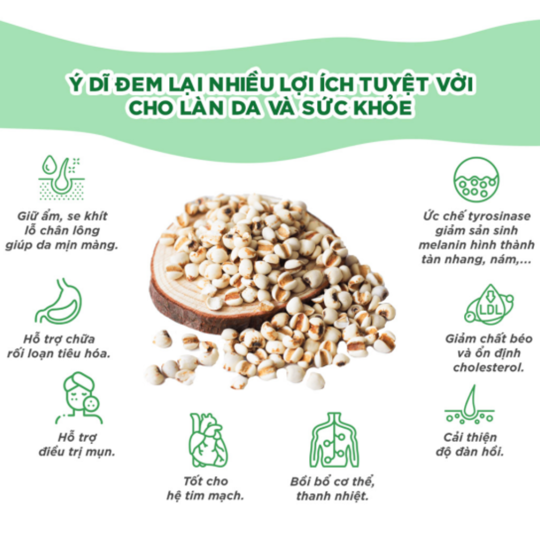 Ít ai biết được rằng thành phần của Hạt ý dĩ chứa nhiều các enzyme phân giải protein có công dụng giúp làm mềm đi các lớp sừng của da. Nhờ đó da trở nên mịn màng như làn da em bé. Hơn thế nữa, nhờ vào đặc tính kiểm soát nhờn mà ý dĩ còn có thể ngăn ngừa được mụn trứng cá hay sợi bã nhờn dư thừa trên da.