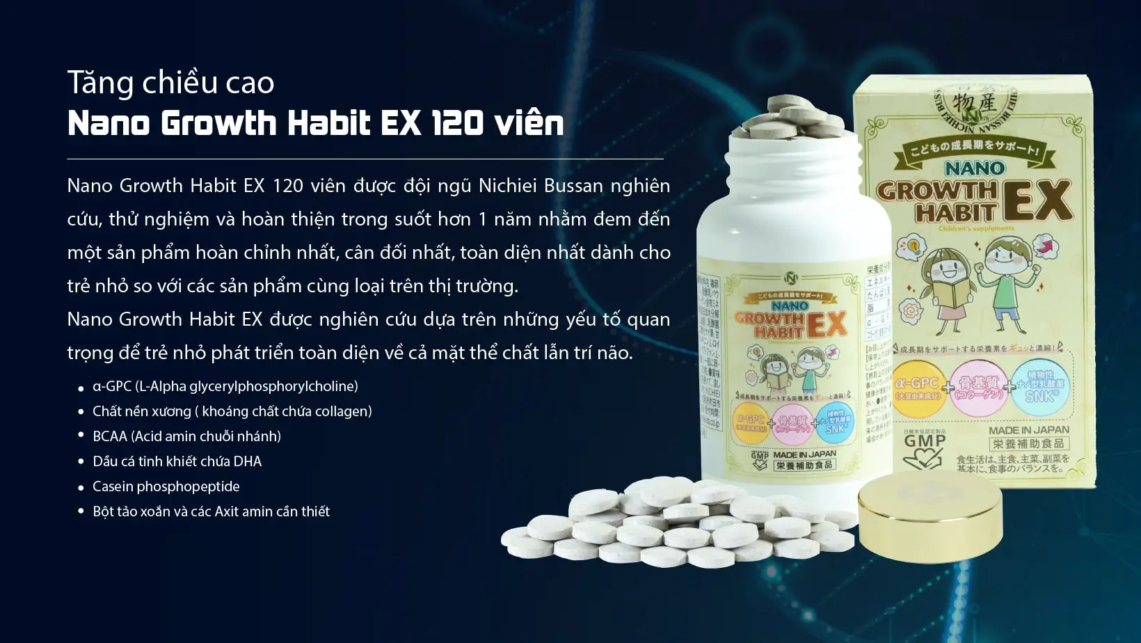 Với lý do đó, sản phẩm Nano Growth Habit Ex ra đời nhằm hỗ trợ tăng chiều cao một cách tự nhiên, chủ yếu dành cho trẻ em trên 6 tuổi.